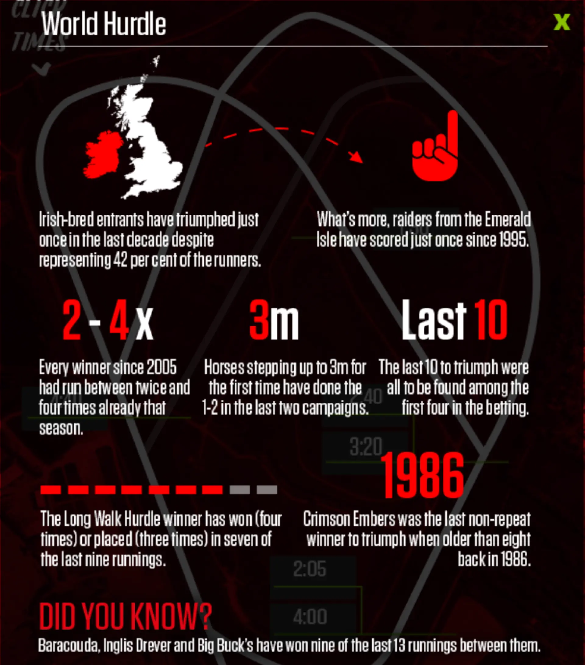 Both are French-bred, as were eight of the last 12 winners (although Big Buck’s skews this somewhat), so nothing between them there.