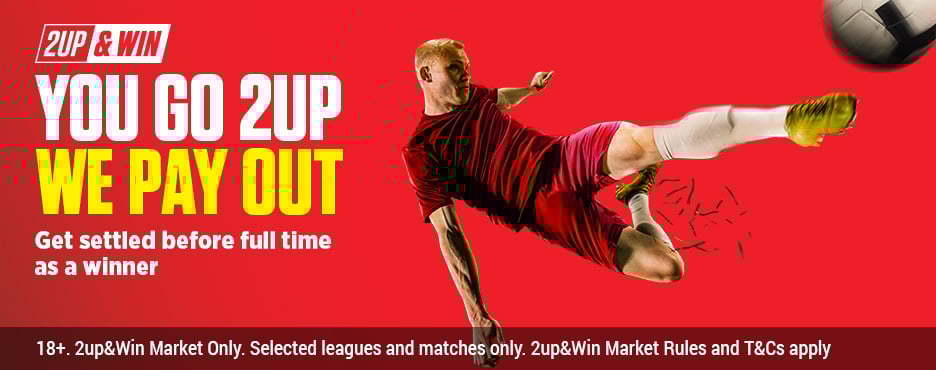 Get paid as a winner if your selected team goes two goals up during the match with our new 2up&win – early payout market.