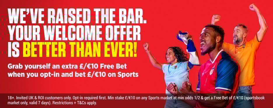 Your first bet just got better! Opt-in and place a £/€10 bet on any Sports market and enjoy a £/€10 Free Bet to use on any Sport of your choice.