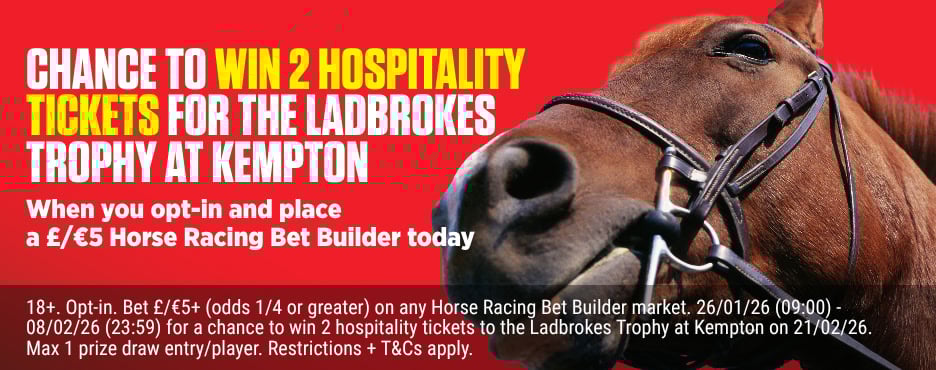 Opt in and place a £/€5+ on any Horse Racing Bet Builder market from 09:00 on 26/01/26 to 23:59 on 08/02/26 for a chance to win 2 tickets to a day at the Ladbrokes Trophy at Kempton on 21/02/26, including hospitality.